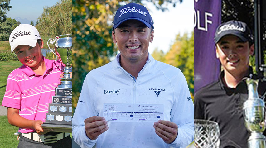 A.J. Ewart Holds His Card After Shooting 59 At Uplands GC In Victoria In The PGA Tour Americas Times Colonist Open. On The Left Is A.J. With The BC Golf Bantam Boys Trophy & On The Right He Holds The Juvenile Boys Trophy