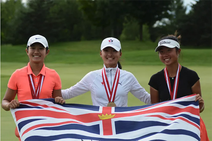 From L-R: BC's Lucy Lin, Yeji Kwon & Erin Lee Hold The BC Flag Image Credit: Gary Yee/Golf Canada