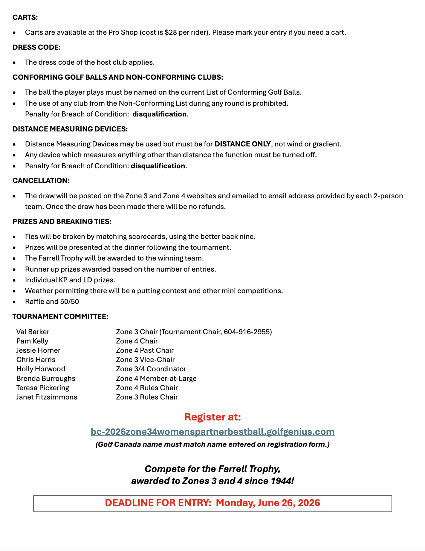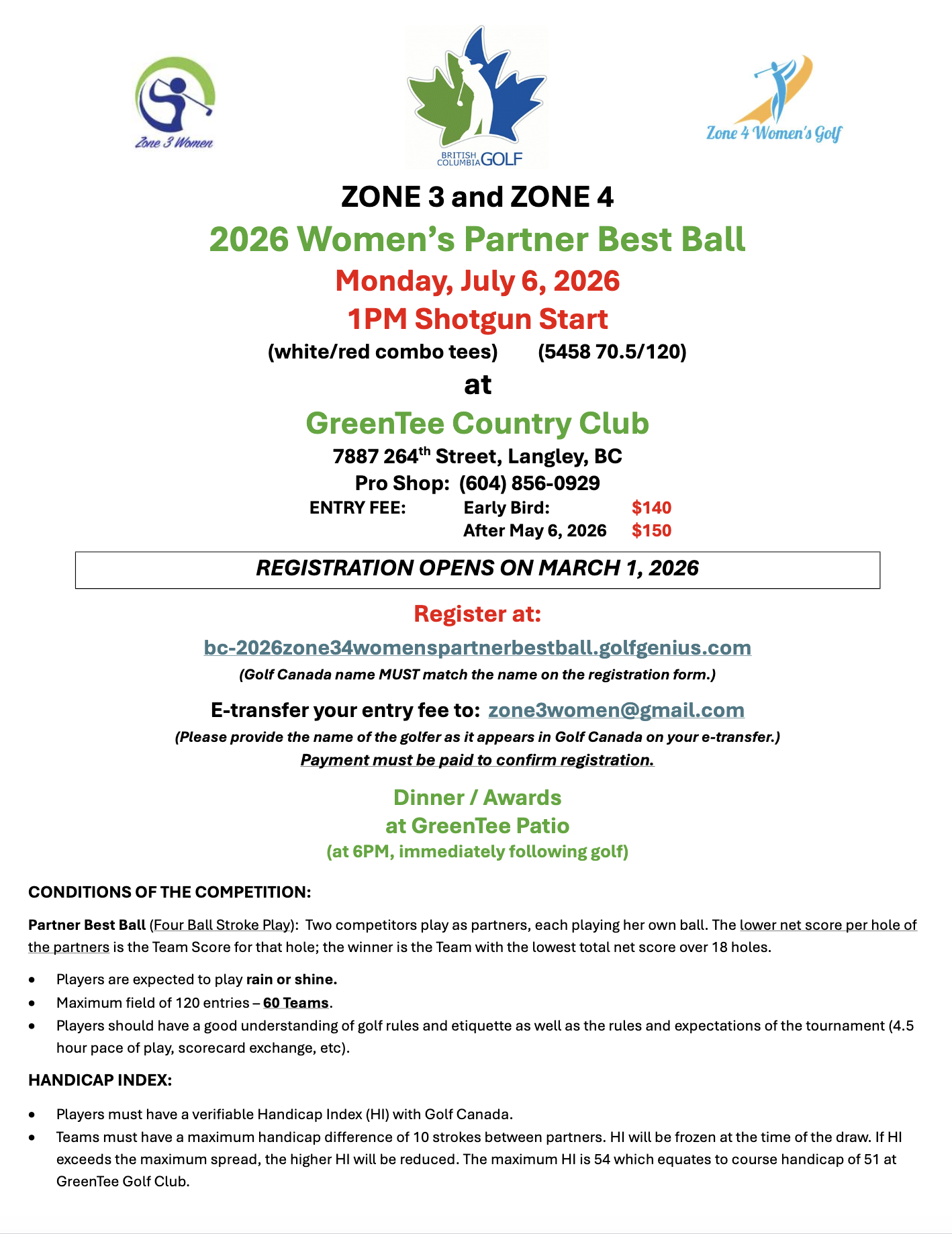 Registration is now open for the 2026 Zone 3 & 4 Women's Partner Best Ball at GreenTee Country Club in Langley on Monday, July 6th.