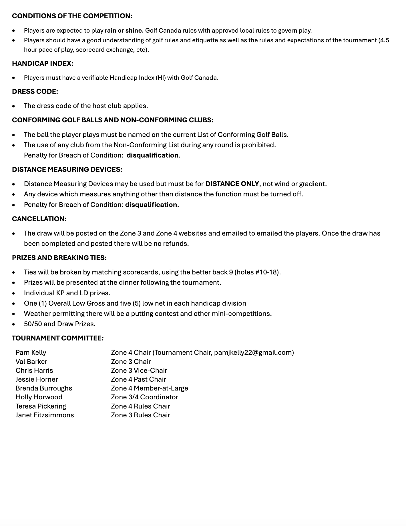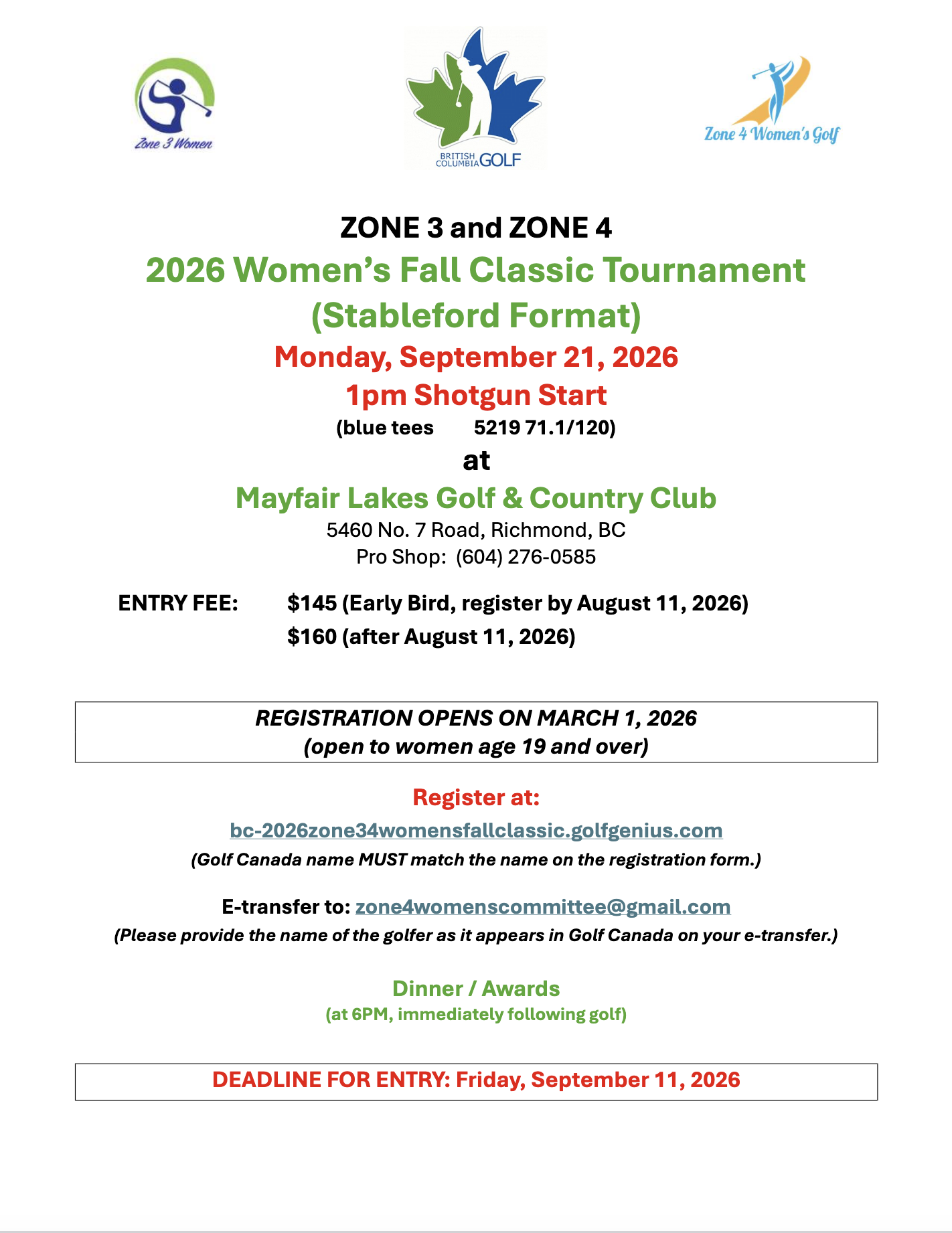 Registration is now open for the 2026 Zone 3 and 4 Women's Fall Classic Tournament, being held at Mayfair Lakes Golf & Country Club in Richmond on Monday, September 21st. The event is using a Stableford scoring system, features a 1PM shotgun start and is open to women aged 19 and over.