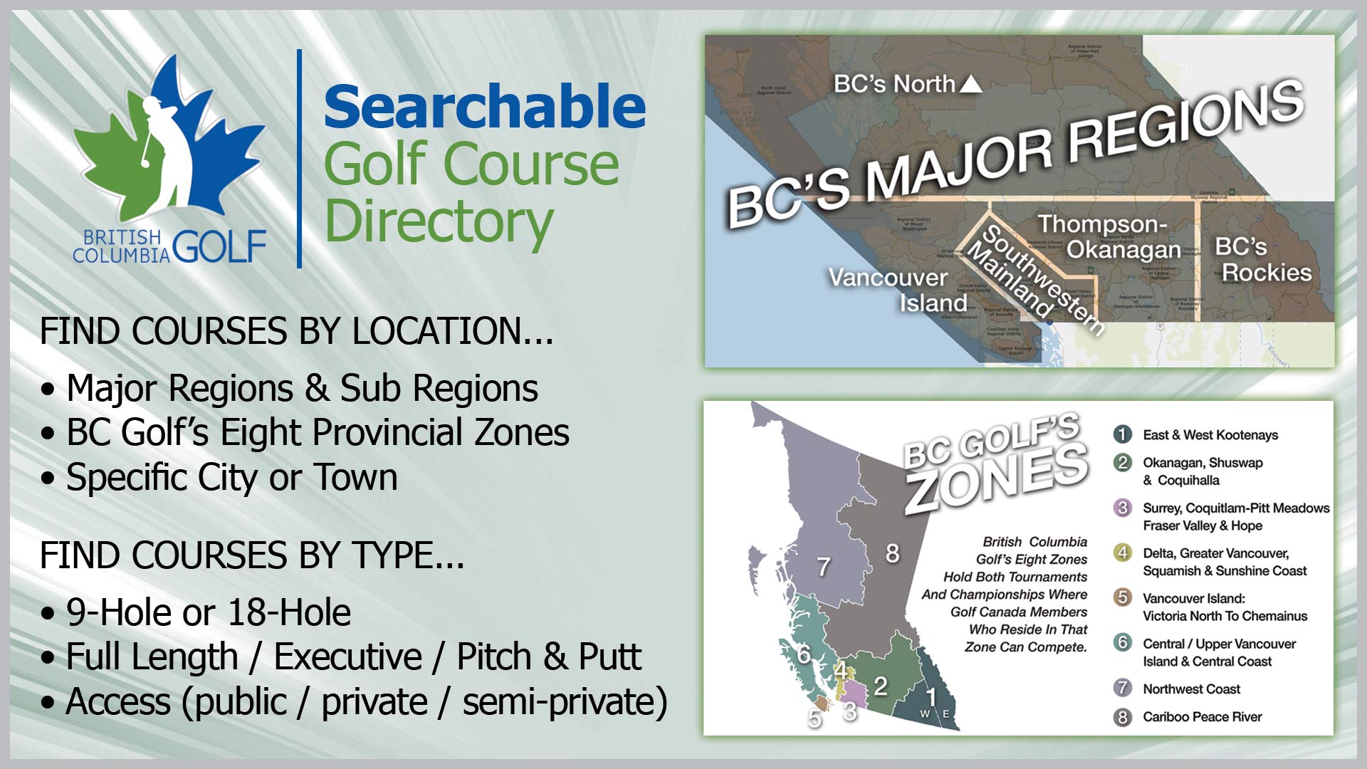 The BC Golf Course Directory allows you to find courses that are right for you either close to where you live or where you plan to visit. Simply select the options you would like to sort on and find complete information on only those courses.